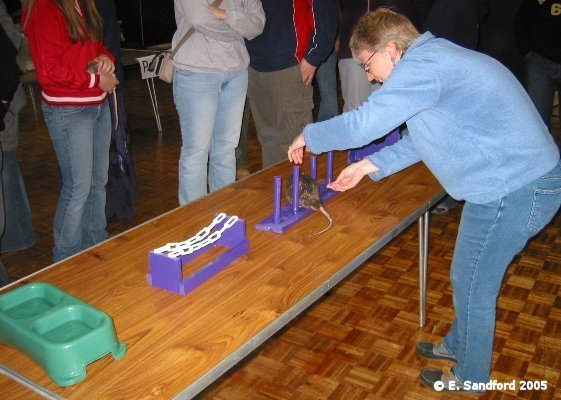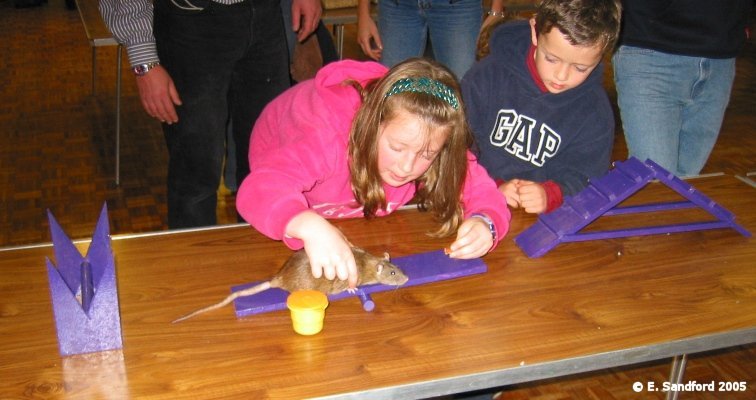 6-8 varying obstacles arranged as a course for rats to follow a route guided by their handler. When thinking obstacles, the kind of things we are looking at are climb over, climb through, balance, weave, water, ramps, tubes, etc. as above. Number of obstacles and shape of course will depend on facilities available. Time allowed for 6-8 obstacles should be 2 minutes maximum and points awarded for speed, number of obstacles completed and style/finesse. Number of obstacles and time allowed may vary from show to show, dependant on what is available and time allowed to run the event. Judging Guidelines