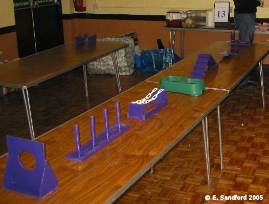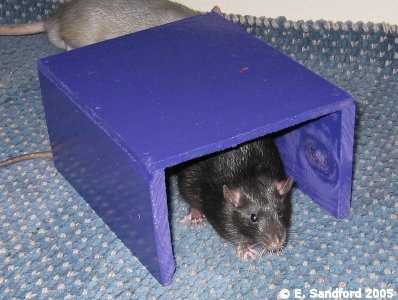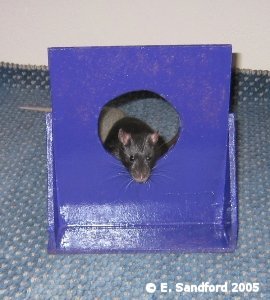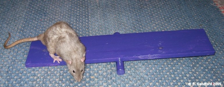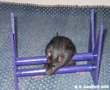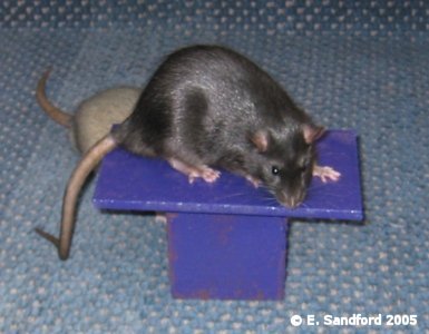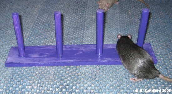 In the last few years the running of rat agility and other fun events has become more and more common at our rat shows. This shows a completely new kind of skill rat owners can do with their rats and with our rats being very intelligent little beasts; they can sometimes be very easy to train to do agility and obedience tests. A few of us have worked on some ideas for scoring agility and obedience type events and to create the guidelines we took onboard how the Swedish Rat Society run their agility events and modified their guidelines to suit ourselves. Below are our draft ideas with guidelines as to the kinds of points that should be awarded. We recently ran a 4 event agility and obedience competition at the Taunton show and it seemed to go down very well with the exhibitors. We created the guidelines for this show and below the agility guidelines are the other suggested events and guidelines. From the experience of running these events, the main things identified were a need to ensure the judge(s) understand what they are looking for in the guidelines, so this may identify a need to have trained agility/obedience judges in the future. I think all the exhibitors went away positive, thinking they need to spend more time with their rats training them for this type of event! Agility ObstaclesAll of the below were made with my own fair hands and I am by no means a DIY expert - usually far more of a 'get someone else to do it' instead! I used MDF and doweling rods and long planks of wood from a DIY superstore. I used nails for most, although wood glue was sturdy enough (I lacked patience and didn't want to wait for glue to dry!), ensured I filed and sanded down all edges and ends so there can be no injury to rat or handler and I found some wonderful purple paint to make the fences really stand out! Quinn, Sierra and Zephyrus kindly modelled the obstacles for me - the nice thing about bucks, you can put them in one place and they will stay there for photos, but it is rare for a buck to make a good agility rat! The show jump