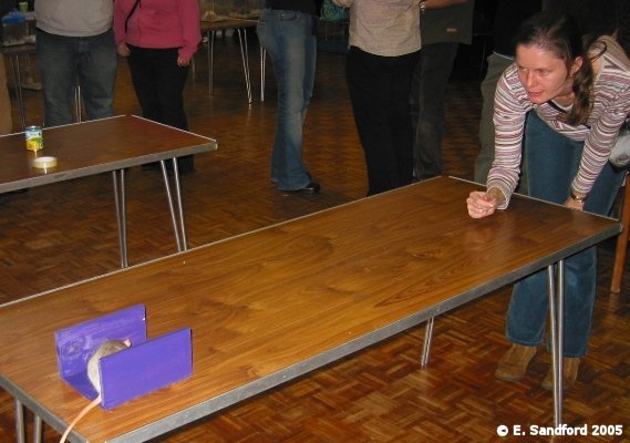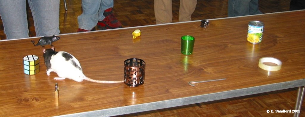 Curiosity is testing the rat’s inbuilt curiosity of their surroundings. It is an event where the handler really has no input and it’s down to the rat. Most rats do quite well in this event. The kinds of items used are random small household items, like keyfob, ornaments, kitchen utensils, plastic rat or similar toys, candle holder, etc. 10 items are randomly placed on a table and the rat is given 1 point per item their nose touches during the allowed 1 minute time. The rat is put on the table at a designated starting point and the handler can encourage verbally and by making signals, but not by any touching of the rat or the table until the designated time is up. If rats touch all the items in under a minute then the winner is the fastest time. ObedienceComing when called The rat is placed at a designated starting point in one corner of the table by its handler and the handler should then move to the corner diagonally opposite and call for the rat. The rat should clearly remain at the starting point until the handler gives a signal to come – this will be the starting point for the stopwatch – rats starting before any command is given should lose 2-3 points based on completion below. A variety of signals (both verbal and noises/handclapping, clicking fingers, tapping table, etc.) can be used but the handler is not allowed to touch the rat after placement on the competition table until the rat has reached the diagonally opposite corner – the handler should not move from the opposite end of the table during the event. Other rats or handlers cannot be used for assistance.