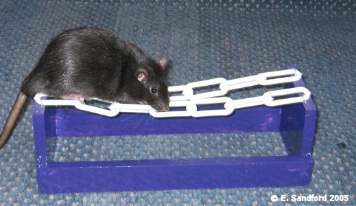The Chain Walk This obstacle was an experiment really, but it has proved to be a real hit with the rats with most completing it quite easily. The gap between the chains is about an inch and they are quite taunt, so the rat doesn't slip off and fall into the middle. Made fairly simply by using two bits from the planks of wood for the ends and 2inch wide for the side ones. The chain is nailed on with fence staples and is plastic so easy enough to clean down. This obstacle could also be used as a jump by turning it the other way on the course. To Summarise... What you tend to find once you have made a few obstacles is that you look at many things around you in a totally different light - kids toys, household stuff and places like DIY stores, garden centres, IKEA, etc. are seen with a whole new light... Key Guidance For Agility