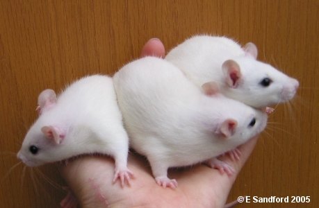 Black Eyed Cream - the continuing story...It has been a while since anyone has updated the progress on the ‘dark eyed cream’ gene that was found in Edinburgh University in Scotland back in 1998 and was initially reported in Pro-Rat-A by Claire Jordan (107, page 9-11), so since the last article on creams was back in 2000, it seems high time for an update on how the breeding and genetics has developed. I do not pretend to be a genetics expert, and I am sure there will be a few genetics experts within the club will rip my theories to shreds! After the initial breeding in Scotland by Donald Dickson, Veronica Simmons made a day trip to Edinburgh to collect a trio of black eyed creams from Claire Jordan so that breeders in the south could work on the variety too. She and Joan Branton bred several litters and were joined later by of Melanie Goulder and they did some excellent work on breeding and improving these lines ‘down south’. Sadly, Joan gave up breeding and Veronica and Melanie eventually both decided to concentrate on their original varieties and let others continue working on the black eyed creams, Siamese and Himalayans. However no one really took them on with a vengeance and there was a point where the genes were nearly lost. A few people who had dabbled with them stopped because there were some temperament problems noted in the lines, and it meant no one seemed to be focusing on them. Aside from Don continuing breeding a few litters of creams before retiring from breeding rats a couple of years back, the other Scottish breeders continued with the ‘taupe’/biscuit rats and their Burmese.