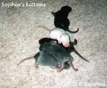 Sapphire during birthing - she gave birth to a litter of 15 healthy kittens! If things do go wrong, you may need to find a foster mum very quickly and also make a start on hand-rearing them. Good articles on hand-rearing kittens are linked below: - Caring for Orphaned Baby Rats or Mice Fortunately, in the vast majority of rat birthings, things go very smoothly and you will have a healthy mum with a healthy bunch of little squeakers. I have found that the majority of does seem to give birth quietly while you are asleep or out! Caring and correct feeding of the kittens starts as soon as they are born. Shortly after the mother has started giving birth, you can offer her tepid water with either sugar or honey in as they appreciate this far more than cold water. You should leave a bowl with her usual dry food in but in addition you should start supplementing the mother with an 'easy' diet - soft, easy to eat, protein foods, like EMP or Orlux (egg food for hand-rearing birds which rats love - soak to porridge consistency), eggs, chicken, tinned or pouched cat and dog foods (look for the good quality higher protein ones aimed at puppies and kittens), fish and anything else she fancies. Pasta, porridge, yoghurts, etc. are also appreciated. She will also appreciate tepid milk, either the baby formula or the ones intended for puppies and kittens are best - this can be either in a bottle or mixed with a little bread in a bowl. My own personal choice for a 'baby mix' is Orlux eggfood (doesn't seem to matter between the budgie and canary version, although I tend to use the budgie one) mixed around half and half with Vitalin original and then adding lactol powder and a little garlic powder and mixing dry - I then soak the mix to porridge consistency and give to mother and babies. You should be careful not to overfeed the kittens with supplemental food as you can cause them to grow too fast and get too fat as young adults and end up causing them to have birthing or breeding problems, so it is important to keep a good supply of their normal dry mix as their main diet. Kittens are born completely naked apart from their whiskers (hence being able to tell rex from straight coat kittens as soon as they are born with either curly or straight whiskers!). By 2-3 days old you can normally see the patterns if they are going to be marked rats and also you can tell what colour the eyes are going to be from the pigment colour under the skin. The kittens eyes will remain closed until around 14 days, but during that first 2 weeks, they will grow considerably and also have their baby coats. They are born at approximately 5-6g and should be around 30-35g by 2 weeks old. Some kittens will blindly start adventuring and also start eating, while others are more interested in staying in the nest and letting mum do all the work! Kittens should be handled from birth regularly on a daily basis. Scientific proof has been given that handling kittens from birth reduces stress and stress related illnesses in later life. I use the Ferplast Duna or Savic Rody cages as nurseries for the first two weeks as these are easy to 'steal' the whole igloo to look at the kittens away from the mother if she gets stressed seeing you handling them when they are very young. Most does become far less stressed about their kittens being handled when the kittens open their eyes and start moving around more and at this stage I prefer to move the kittens to a low level cage like a Ferplast Mary and give mum a hammock so she can escape the babies for a rest. Below are a selection of pictures from 1 day to 14 days: -