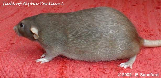 Jadi is a normal coated rat - the coat is smooth and glossy and feels soft to touch. Bucks coats are coarser than does, but both should have a coat that covers the whole body with no bald patches. Bald patches on rats are abnormal, but normally due to injury or barbering - over aggressive grooming by cage mate or by self if it's only front legs and/or belly affected. Hairless rats have little or no hair and may or may not have whiskers and eye lashes as well. If they do have whiskers they will be curly and need to be checked as per rex whiskers for irritation. Hairless rats often suffer eye problems and also can be easily damaged or bruised from injury with no coat to protect them. Rats go through many moults in life, but the most dramatic one is the moult between kitten and adult coat, when they lose there soft baby fluff and their sleek adult coat emerges. This is usually between 4-8 weeks. They can look dramatically streaky during this moult time! Tail -