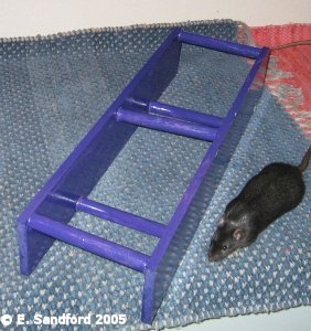 The Ramp This obstacle was my greatest challenge and took the longest to create. I cut two planks and then had to angle the ends to join them and also allow the base ends to sit flat on the table. I added side bars to make the fence more solid and using square doweling for the steps on the ramps. With practice, it would be ideal to have rats touching below both bottom steps as would be expected in dog agility.