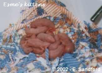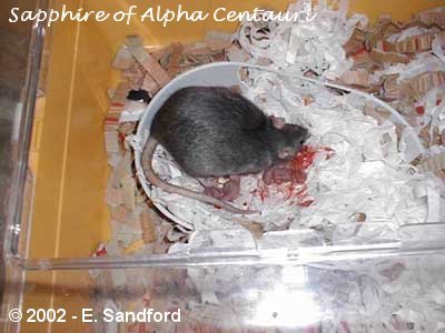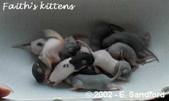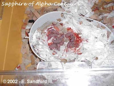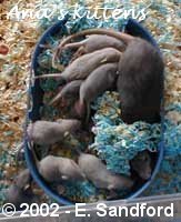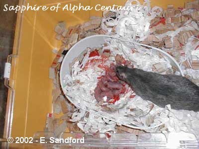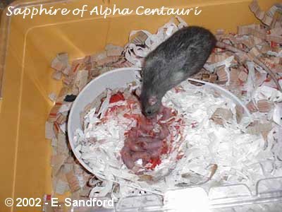 Sapphire during birthing - she gave birth to a litter of 15 healthy kittens! If things do go wrong, you may need to find a foster mum very quickly and also make a start on hand-rearing them. Good articles on hand-rearing kittens are linked below: - Caring for Orphaned Baby Rats or Mice Fortunately, in the vast majority of rat birthings, things go very smoothly and you will have a healthy mum with a healthy bunch of little squeakers. I have found that the majority of does seem to give birth quietly while you are asleep or out! Caring and correct feeding of the kittens starts as soon as they are born. Shortly after the mother has started giving birth, you can offer her tepid water with either sugar or honey in as they appreciate this far more than cold water. You should leave a bowl with her usual dry food in but in addition you should start supplementing the mother with an 'easy' diet - soft, easy to eat, protein foods, like EMP or Orlux (egg food for hand-rearing birds which rats love - soak to porridge consistency), eggs, chicken, tinned or pouched cat and dog foods (look for the good quality higher protein ones aimed at puppies and kittens), fish and anything else she fancies. Pasta, porridge, yoghurts, etc. are also appreciated. She will also appreciate tepid milk, either the baby formula or the ones intended for puppies and kittens are best - this can be either in a bottle or mixed with a little bread in a bowl. My own personal choice for a 'baby mix' is Orlux eggfood (doesn't seem to matter between the budgie and canary version, although I tend to use the budgie one) mixed around half and half with Vitalin original and then adding lactol powder and a little garlic powder and mixing dry - I then soak the mix to porridge consistency and give to mother and babies. You should be careful not to overfeed the kittens with supplemental food as you can cause them to grow too fast and get too fat as young adults and end up causing them to have birthing or breeding problems, so it is important to keep a good supply of their normal dry mix as their main diet. Kittens are born completely naked apart from their whiskers (hence being able to tell rex from straight coat kittens as soon as they are born with either curly or straight whiskers!). By 2-3 days old you can normally see the patterns if they are going to be marked rats and also you can tell what colour the eyes are going to be from the pigment colour under the skin. The kittens eyes will remain closed until around 14 days, but during that first 2 weeks, they will grow considerably and also have their baby coats. They are born at approximately 5-6g and should be around 30-35g by 2 weeks old. Some kittens will blindly start adventuring and also start eating, while others are more interested in staying in the nest and letting mum do all the work! Kittens should be handled from birth regularly on a daily basis. Scientific proof has been given that handling kittens from birth reduces stress and stress related illnesses in later life. I use the Ferplast Duna or Savic Rody cages as nurseries for the first two weeks as these are easy to 'steal' the whole igloo to look at the kittens away from the mother if she gets stressed seeing you handling them when they are very young. Most does become far less stressed about their kittens being handled when the kittens open their eyes and start moving around more and at this stage I prefer to move the kittens to a low level cage like a Ferplast Mary and give mum a hammock so she can escape the babies for a rest. Below are a selection of pictures from 1 day to 14 days: -