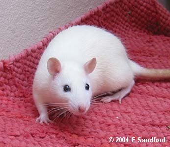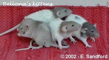 The sections below are written with UK breeders and breeding in mind. As a general rule, we do not have the 'feeder' rat issue as it is illegal to sell live foods in UK pet shops and also we do not have quite the same issues with quarantine and SDA type infections as the USA has. Please check out the article on Mentoring for new breeders You should ask yourself quite a few questions before considering breeding from your rats. The most important one must be, what are you going to do with anything up to 20 kittens! There is far more to breeding than putting a buck and doe together! Why do you want to breed? Breeding is not cheap - new cages, extra food and bedding and also potential vets bills will all need to be considered. If you are breeding for show, then you need to consider genetics and obtaining quality stock from the relevant breeders. Choosing the right homes for your kittens can be hard. Things can go wrong, worst case scenario, does can actually die giving birth, although it's not that common. Lots of time to socialise the kittens is needed as well. You should have aims and objectives of what you are trying to achieve in breeding each litter you breed. It is highly recommended to find yourself an experienced breed to mentor you in your new venture. Homing of surplus kittens? by being listed on a rat club breeders list (NFRS do one - breeders@nfrs.org), personal websites, online forums, and word of mouth/friends. Would you be prepared to keep anything you cannot find homes for? - if the answer to that one is no, you shouldn't be breeding! It is worth sounding out your possible outlets before you decide whether to breed or not. Some breeders do cull unwanted kittens and even older rats, but that is down to personal ethics. Many reasons are given for culling - does not being able to raise large litters, poor type in rats, not being able to home the kittens, disposing of unwanted colours and markings within litters, and more. I believe that quality pet rats and show rats can be produced without the need for culling and my rats have proved this many times by reaching champion status and winning pet classes. Some of the breeders who cull kittens also cull retired adults, so are unlikely to know the longevity of their lines or the health beyond about a year old. Genetics and temperament. Both important. You can have the most wonderful temperament rats in the world, but if they have any genetic defects or there are genetic defects in the line, they should not be bred from. I feel that it isn't actually about temperament as such, but more about the personality of the rats - rats should have character while being people orientated and friendly. Bear in mind that if your favoured variety is of colours that are difficult to home (will explain the very basics of colour genetics later!), then it's probably better not to breed from them when you first start breeding, unless you know you can find homes for a full litter of the less popular varieties or plan to cull! As a breeder develops a reputation and gets more well known, they do generally find it easier to find homes for even the less popular varieties. If you have a preference of which varieties you wish to breed, then you need to select rats accordingly. I think it is really important for a breeder to breed the variety (or varieties) they are passionate about. Cage space. You need at least 2 reasonable sized cages for the kittens if you plan to breed. Assuming you get 2 young does for breeding, you cannot guarantee that these does will live together during the period of one doe having kittens. If you breed both at the same time, (which I wouldn't necessarily recommend as you could be looking at 30+ kittens in one go!!) you should not leave them together as they can steal kittens from each other and can fight over them and end up killing them or one doe can end up nursing them all leaving the other with none. Assuming that you breed one doe and she lives quite happily with her mate through the birthing and kittens stage, you would still need cages to separate bucks from does at between 4-5 weeks of age. Kittens grow very fast and by 5 weeks need a lot of space to run around in as they have so much energy! Basics of colour and coat