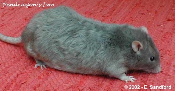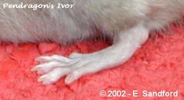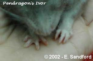 Rats toes are four fingers at the front and 5 toes at the back. Claws (toe-nails) should be nice and short - trimmed regularly to lose the 'white tips' beyond where the dark area behind the toenail is. In the above pictures, you should be able to make out where the dark part ends. Ivor's toe-nails are impeccably trimmed!! You should regularly check the undersides of the feet for cuts and sores - sores may be a condition known as bumblefoot. Toe injuries are not uncommon and these tend to bleed profusely, so it is worth having some styptic powder handy as a just in case. When rats walk across other rats cages, they can even sometimes end up with toes being bitten off and it it not that uncommon to 'rip off' the odd toenail as well. Other things to watch around the feet are for the legs being stripped of hair, this is usually self barbering, which is a bad habit a bit like us chewing our finger nails, quite often stress related and almost always something they will always do - usually they will barber bald patches on their cage mates as well. Also look for red staining on the inside of the front legs; this indicates that they may have some sort of respiratory problem and a nasal discharge. Coat -