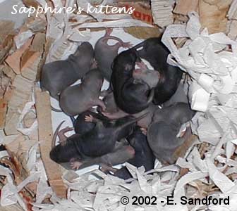 2 days old - you can start to see the pigment showing that some of these kittens are going to be quite dark in colour and also that they have dark eyes. On marked kittens you can see the skin pigment where the hood or dark patches will be later as per the 3 day old kittens from Faith's litter below right.