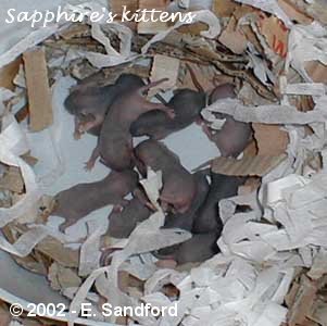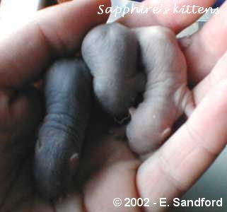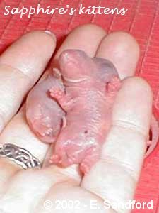 When kittens are born they tend to average about an inch long and normally weigh between 6-7g. You can see the white milk bands across the stomach area on the 2 hour old kittens below. The kittens pictured below are Sapphire and Axel's litter unless otherwise stated.